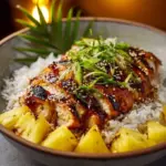 Ein tropisches Gericht mit zartem Hühnchen, mariniert in Ananassaft und Sojasauce, serviert mit cremigem Kokosreis.