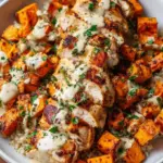 Ein herzhaftes Gericht mit zartem Hühnchen, knusprigen Süßkartoffeln und einem cremigen Tahini-Dressing.